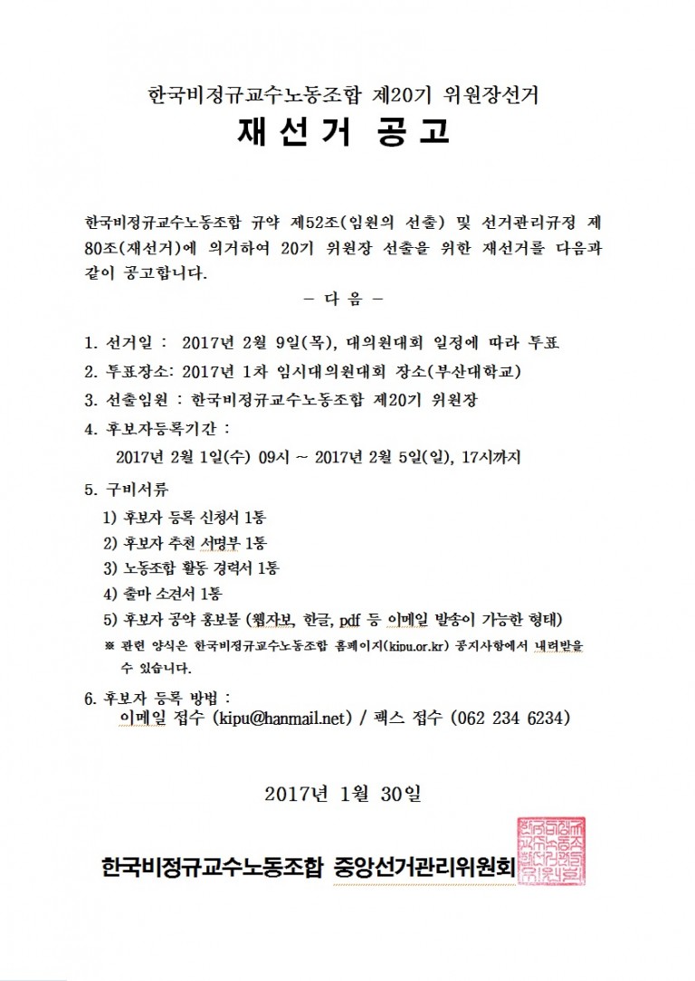 한국비정규교수노동조합 위원장 선거 재선거 공고