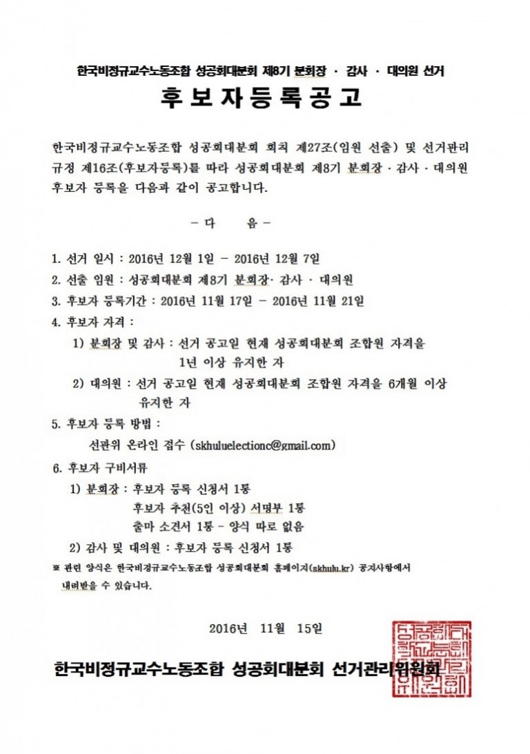 제8기 분회장 · 감사 · 대의원 후보자등록 공고