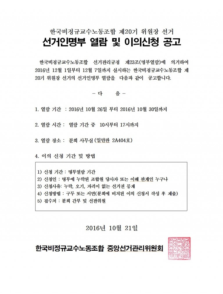 20기 위원장 선거 선거인명부 열람 및 이의신청 공고