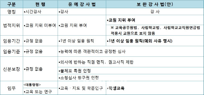 개정안은 시간강사에게 ‘교원’ 신분을 부여한 게 골자다. 현행법에서 대학 교원은 교수, 부교수, 조교수로 구분되는데 개정안은 여기에 ‘강사’를 추가했다.