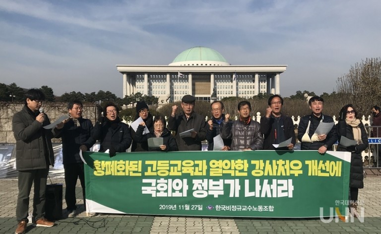 11월 27일 한국비정규교수노동조합(이하 한교조)는 “황폐화된 고등교육과 열악한 강사처우 개선에 나서라”며 국회와 정부를 규탄하는 기자회견을 열었다. 한교조는 “강사의 고용안정과 처우개선을 위한 개정강사법이 시행됐지만 국회와 대학의 구태로 짓밟혔다”고 비판했다. 그러면서 정부의 2020년도 예산안 규모와 국회의 예산안 심의 과정, 대학의 이익 극대화 행위 등을 지적했다.