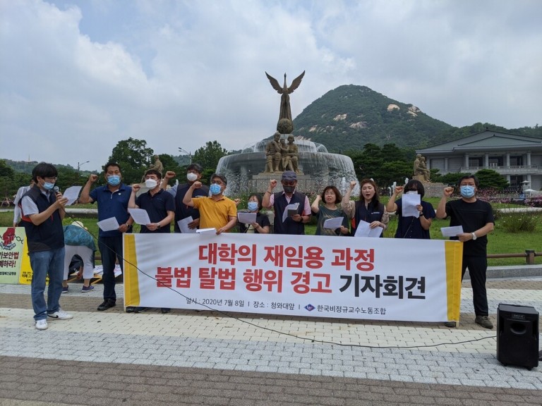 한국비정규교수노동조합(한교조)은 8일 오전 11시 청와대 앞에서 기자회견을 열고, “강사법 이후 첫번째 재임용 절차가 진행되는 지금 일각에서 법 취지를 거스르며 강사의 재임용을 거부하는 불법과 탈법이 벌어지고 있다”고 주장했다. 지난해 8월1일부터 시행된 강사법은 강사에게 교원으로서의 지위를 부여하고, 이에 따라 3년 동안 재임용 절차를 보장한다. 지난해 2학기에 채용된 강사들은 특별한 결격사유가 없는 한 정당하게 재임용 심사를 받을 수 있다는 뜻이다.