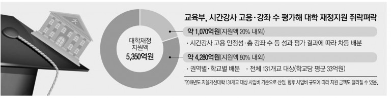 대학 재정지원사업에도 '강사법'이 쟁점이 될 전망이다. 교육부가 시간강사들의 고용 안정성을 혁신지원사업 성과지표에 넣는 방안을 검토중이다. 평가에 따라 지원금액에 차등을 두기로 해 실제 효과를 거둘 수 있을지 주목된다.