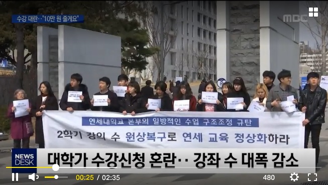 오는 8월 강사법 시행을 앞두고 대학마다 시간 강사 숫자 줄이기에 나서면서, 학생들까지 피해를 보고 있습니다. 강좌 수가 줄어서 수강신청 대란이 일어나고, 학생들 사이에선 돈을 주고 강좌를 사고파는 일까지 벌어지고 있습니다.